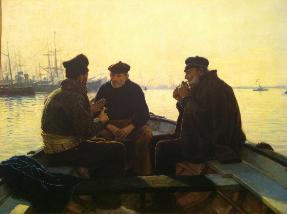 Beneath the sky—the men. Three of them, clearly fishermen. Hunched yet poised, engaged in serious exchange, perfectly rendered in dark, thoughtful shadow beneath all that ebullient sky. Working it out, facing their fates. One man counts off the fingers of his left hand, giving the report in detail. Another, forever locked in the posture of the day’s first smoke, sits listening. There is the calm water beneath, the slosh of the tide gently rising. Theirs is the focus of three men with something grave and serious and wholly unresolved at stake.